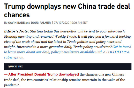Link:https://www.politico.com/newsletters/weekly-trade/2020/07/13/trump-downplays-new-china-trade-deal-chances-789120
