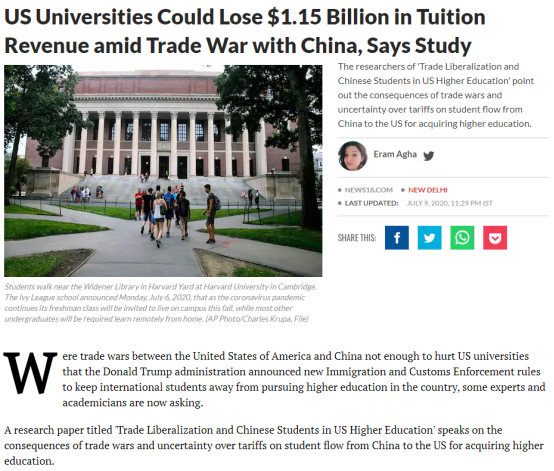 Link:https://www.news18.com/news/india/us-universities-could-lose-1-15-billion-in-tuition-revenue-amid-trade-war-with-china-says-study-2708697.html